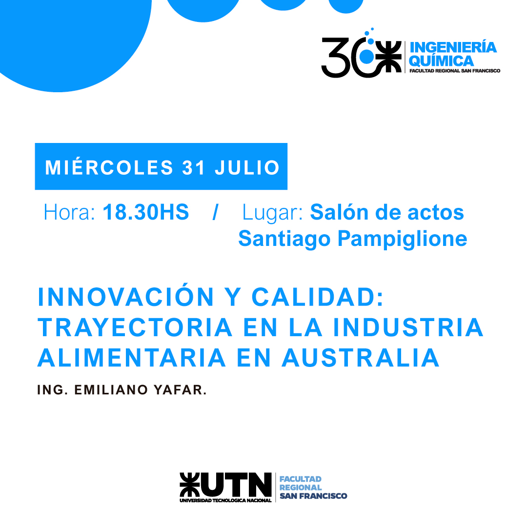 “Innovación y calidad: trayectoria en la industria alimentaria en Australia”, a cargo de Emiliano Yafar, Ingeniero Químico graduado de la Facultad Regional San Francisco de la Universidad Tecnológica Nacional. Actualmente trabajando para la firma Gelato Messina en Sydney, Australia.