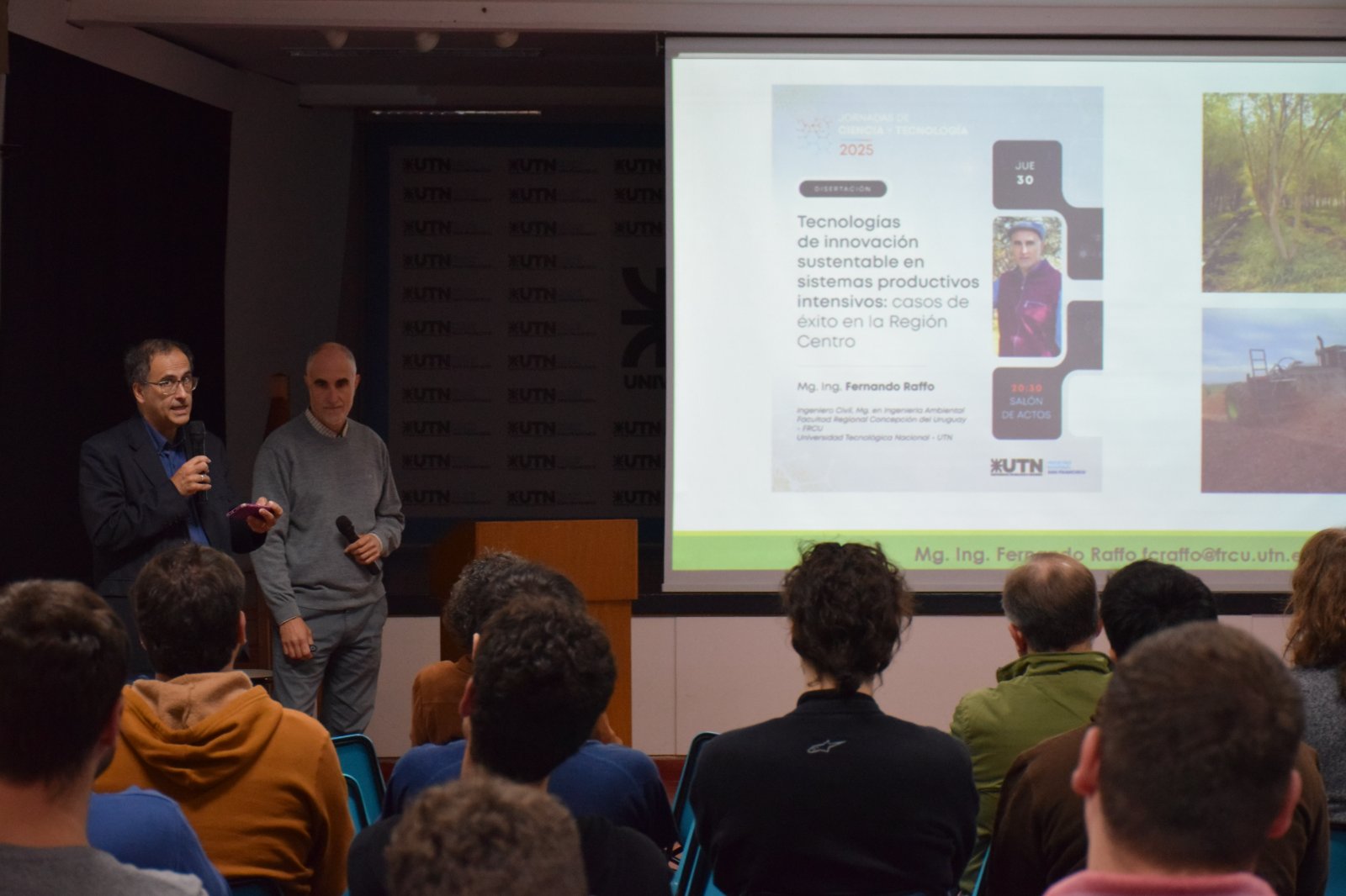 Las actividades proseguirán el jueves 30, esta vez con el salón de actos de nuestra Facultad como punto de encuentro. Allí las presentaciones darán inicio a las 16. Y como cierre de las Jornadas de Ciencia y Tecnología 2025 a las 20.30 se concretará la disertación de Mg. Ing. Fernando Raffo, docente investigador de UTN Concepción del Uruguay, sobre “Tecnologías de innovación sustentable en sistemas productivos intensivos: casos de éxito en la Región Centro”.