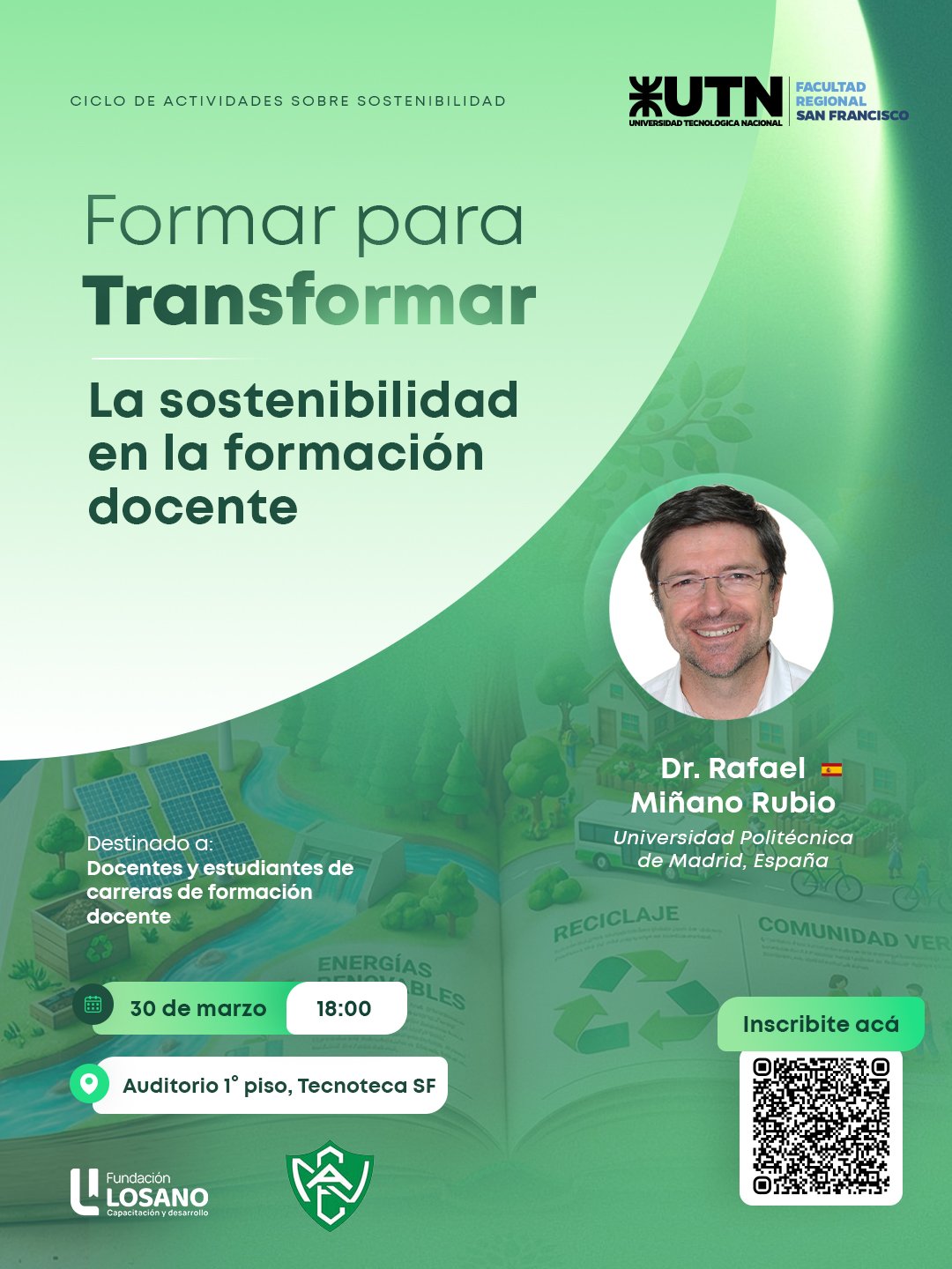 Además de las capacitaciones en UTN San Francisco, el Dr. Miñano Rubio dará una charla sobre “Repensar la Enseñanza: Sostenibilidad como compromiso educativo”, el jueves 26 a las 18 en la Tecnoteca, dirigida a docentes de todos los niveles del sistema educativo y público en general. Esta propuesta requiere inscripción previa.