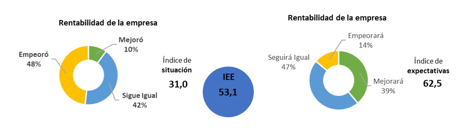 En ese marco, el índice de evaluación de las empresas alcanzó los 53,1 puntos, con una diferencia significativa a favor de las expectativas respecto del presente, ya que al hablar de la rentabilidad de las empresas, un 48% dijo que "empeoró", un 42% señaló que "sigue igual", y para un 10% "mejoró". Pero al proyectar a futuro, esos números varían: un 47% dijo que espera que la rentabilidad de la empresa siga igual, un 39% afirma que "mejorará", y para un 14% "empeorará".
