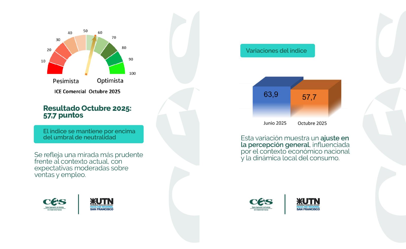 Se dio a conocer días atrás el resultado del segundo relevamiento del Índice de Confianza Empresarial Comercial (ICE Comercial), correspondiente al mes de octubre de 2025, y que se ubica en 57,7 puntos. Este dato surge de un trabajo realizado por el Grupo de Investigación y Desarrollo del Observatorio de Empresas Agropecuarias de la carrera de Licenciatura en Administración Rural de nuestra UTN San Francisco, junto al Centro Empresarial y de Servicios de San Francisco (CES).