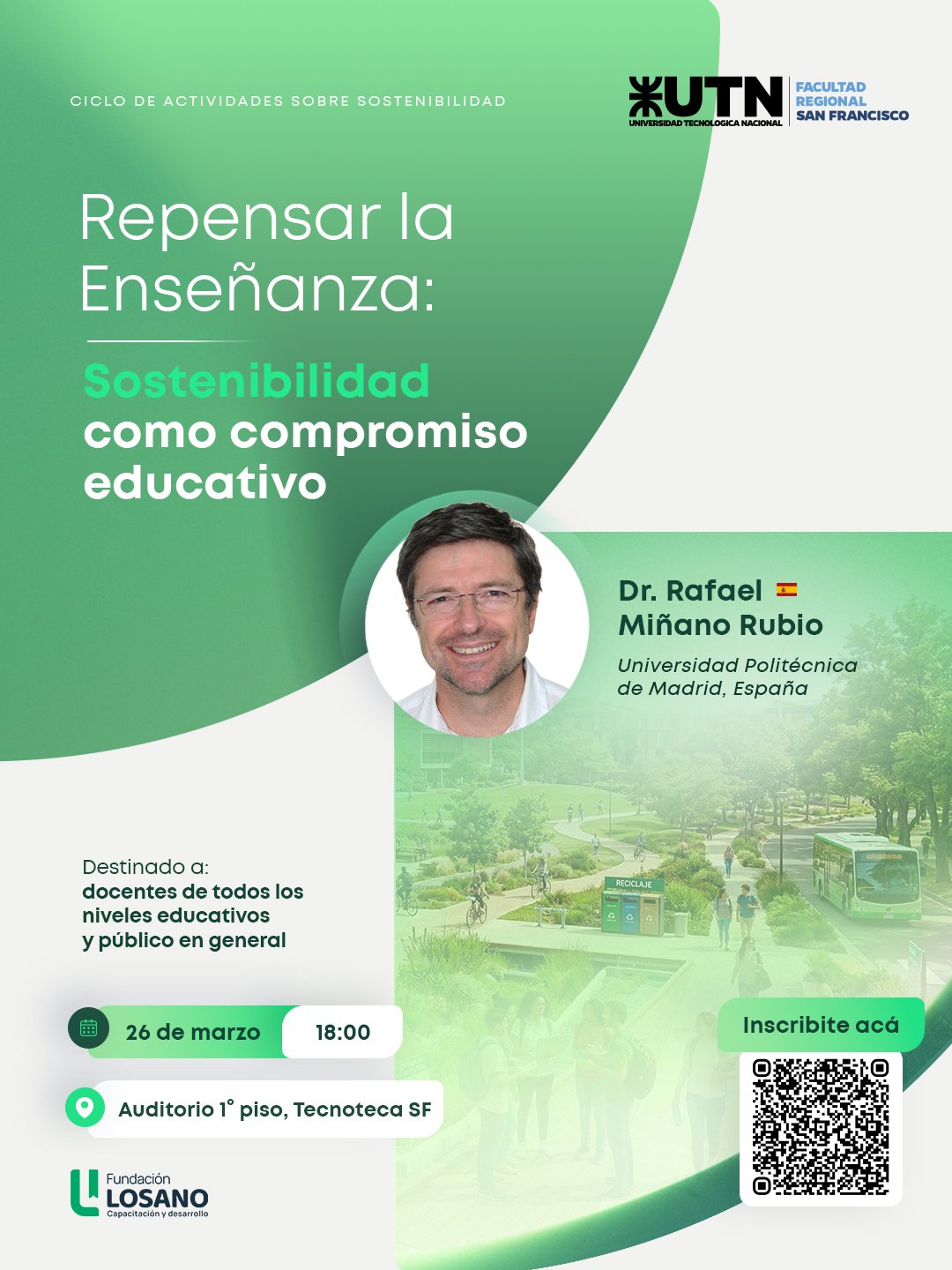 Además de las capacitaciones en UTN San Francisco, el Dr. Miñano Rubio dará una charla sobre “Repensar la Enseñanza: Sostenibilidad como compromiso educativo”, el jueves 26 a las 18 en la Tecnoteca, dirigida a docentes de todos los niveles del sistema educativo y público en general. Esta propuesta requiere inscripción previa.