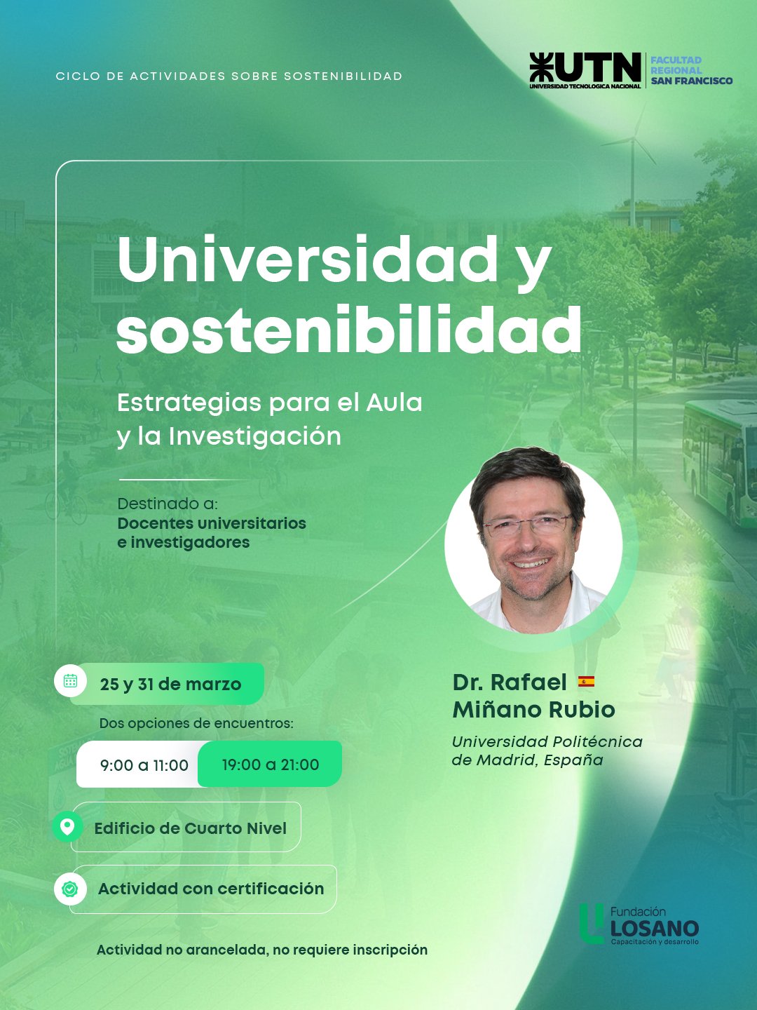 El próximo miércoles 25 comenzará a desarrollarse en UTN San Francisco una capacitación denominada “Universidad y sostenibilidad: estrategias para el aula y la investigación”, a cargo del Dr. Rafael Miñano Rubio, referente en la Universidad Politécnica de Madrid (UPM).