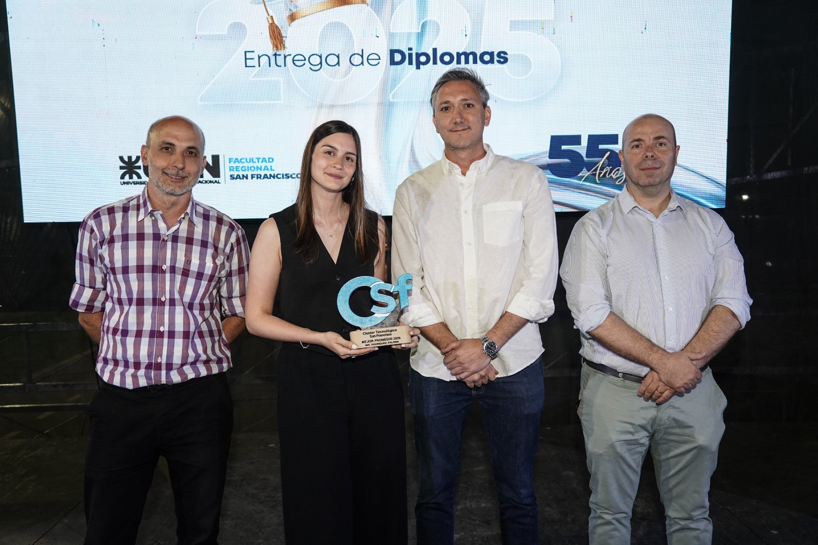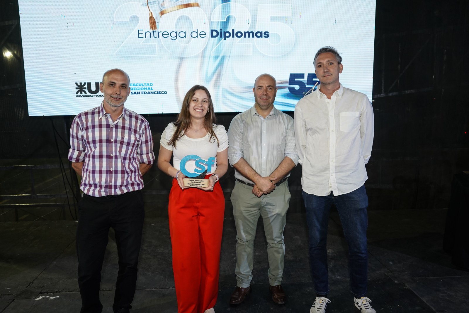 Además, se reconoció a Sofía Ontivero (Ingeniería Química, 9.07), Carlos Enrique Frutos (Ingeniería en Sistemas de Información, 8.93), Paloma Rodríguez (Ingeniería Industrial, 8.69), Federico José Chiessa (Ingeniería Electromecánica, 8.71), Nadia Anahí Massini (Licenciatura en Administración Rural, 7.96) y al mejor promedio de la Tecnicatura Universitaria en Programación, Matías Madoery, con un promedio de 9. Todos ellos recibieron sus distinciones de parte del Clúster Tecnológico San Francisco.